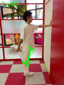 片手を壁につけてバランスをとりながら片足立ちをし、もう片方の手で同じ方の足を(右手なら右足を、左手なら左足を)お尻の後方へ引き上げてください。