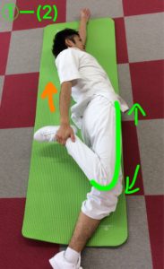 次に、床に横向きになり、床側の手足は軽くのばして安定させ、ストレッチ①と同じように手で足を引き上げてください。