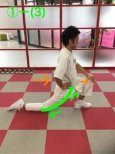 そして最後に、片膝を立てて立ち、股関節を前に押し出してください。
