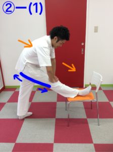 片方の爪先を上に向けて椅子などの上にのせ上体を前に倒してください。