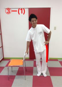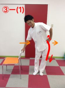 テーブルや椅子に手を置いて立ち、上半身を軽くテーブルに傾け、お尻をテーブルと反対方向に突き出してください。