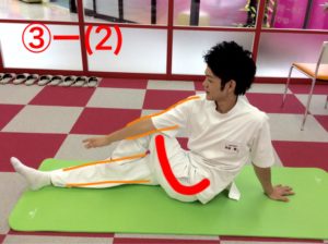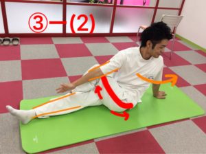 そして、曲げた足の上に伸ばしている足と同じ方の腕をのせ、身体をひねります。
