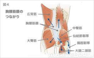 そこでは腹横筋が働くと後部靭帯系にテンションがかかると説明しましたが、その後部靭帯系の具体例がこの筋膜で、胸腰筋膜といいます。