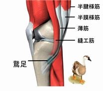 半腱様筋(はんけんようきん)、薄筋(はくきん)、縫工筋(ほうこうきん)は脛骨の内側にまとまって付着しています。この3つの筋を総称して鵞足と呼びこの部位に起きた炎症を鵞足炎といいます。膝を曲げ伸ばししたときや、患部を指で押した時などに膝の内側が痛みます。初期は膝を動かしたときのみに痛みを感じますが、悪化すると安静時痛も現れ日常生活にも支障をきたします。