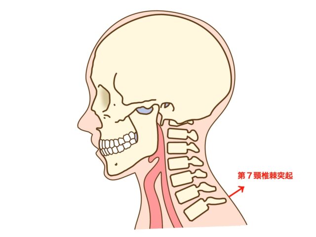 1. 首を前に曲げた際に出る骨(第7頸椎棘突起)に指を当てる
