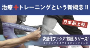 これはコンプレフロスというゴム状のバンドを使い【fascia】と呼ばれる軟部組織の癒着を剥がし、疼痛の緩和、除去、可動域の改善を図る施術です。