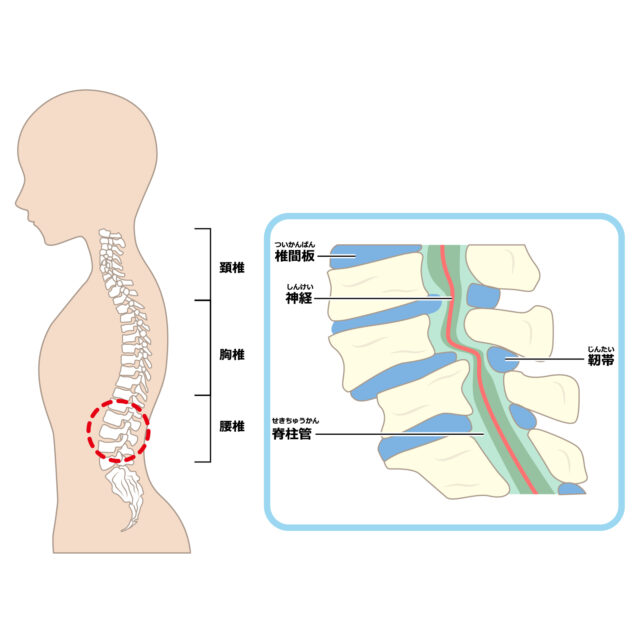 脊柱管狭窄症とは脊柱管が狭窄(狭くなる)することで、痛みやシビレを引き起こすことです。