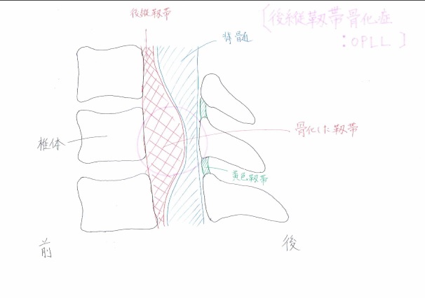 椎体及び椎間板の後面にあり脊柱管の前壁をなす後縦靭帯が肥厚、骨化し脊髄を緩徐に圧迫して脊髄症状を引き起こす疾患。