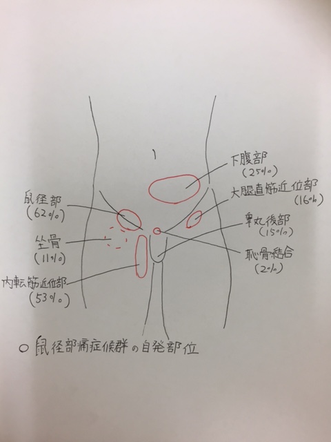 痛みの出る部位としては 鼠径部、内転筋近位部(内ももの付け根)、恥骨結合部、坐骨部、下腹部、睾丸後部など様々です。