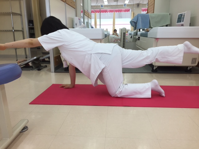 〇股関節だけに負担が集中しないようにするために、上肢や体幹と下肢を効果的に連動させる協調性の訓練(反対側の上肢を連動して持ち上げます)