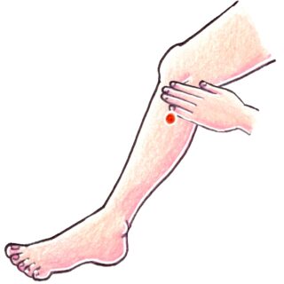 ひざのお皿のすぐ下の外側のくぼみに人さし指をおき、指幅4本そろえて小指があたっているところに存在します。