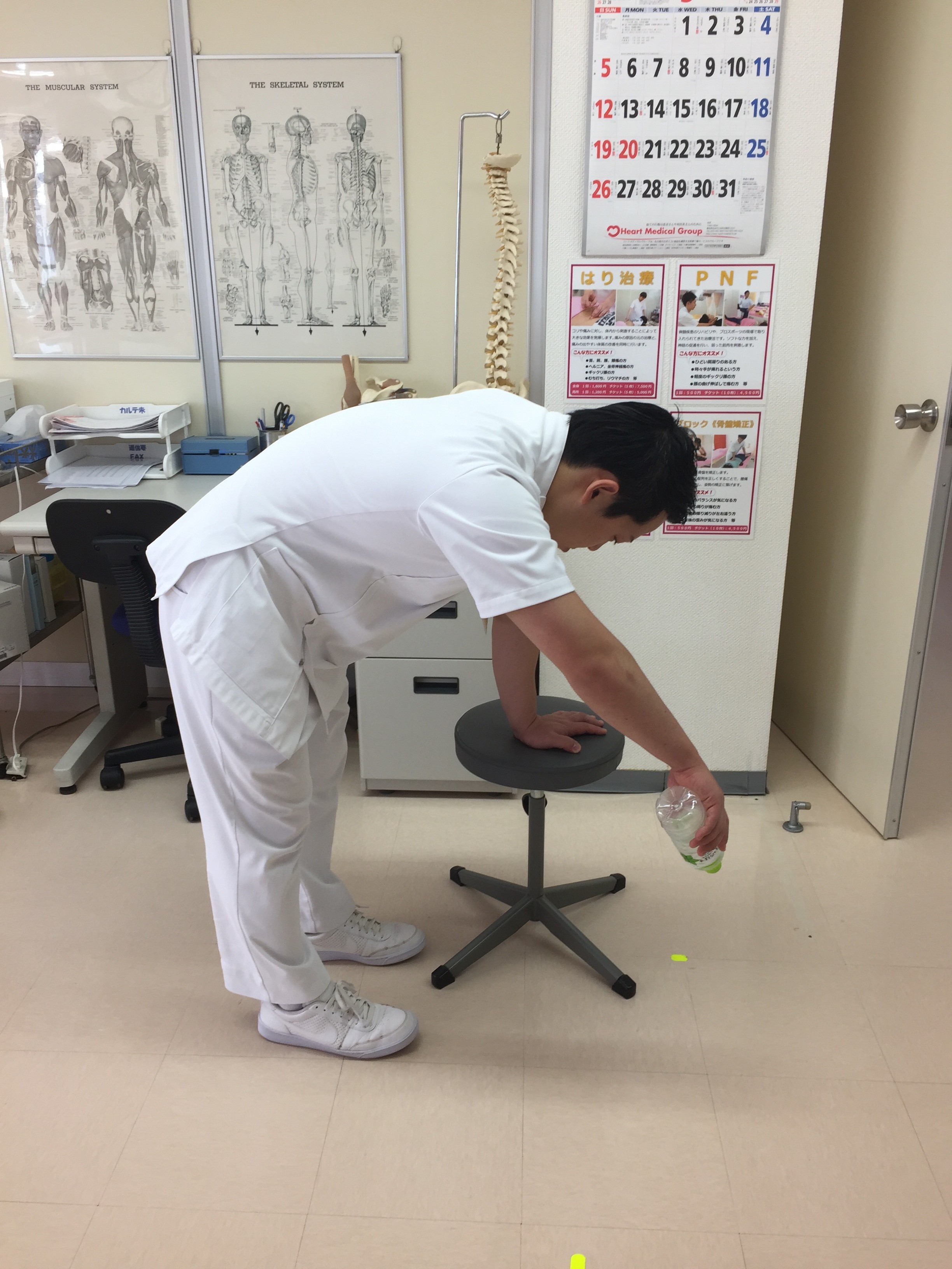 ※この時期にオススメの体操がコッドマン体操です。片手で手をつき、もう一歩の手で水を入れたペットボトル持ち、振り子のように動かします。痛みの出ない範囲で、10往復を1セットとし1日1~3セット行います。