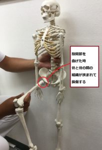 股関節が少し前方に移動することで、股関節を曲げた時に接触しやすくなり損傷を起こします。